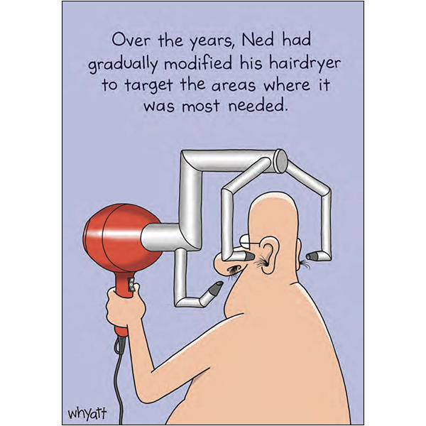 Cover verse: Over the years, Ned had gradually modified his hairdryer to target the areas where it was most needed.