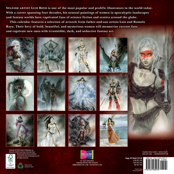 Spanish artist Luis Royo is one of the most popular and prolific illustrators in the world today. With a career spanning four decades, his sensual paintings of women in apocalyptic landscapes and fantasy worlds have captivated fans of science fiction and erotica worldwide. This calendar features a selection of artwork of bold, beautiful, and mysterious women.